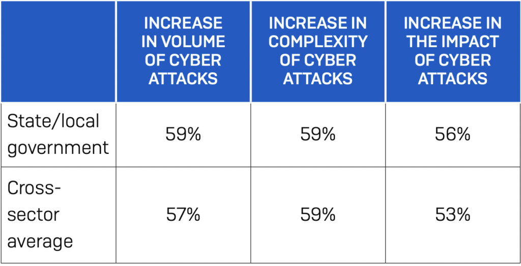 • Inadequate cybersecurity resources and personnel. As the chief security officer in a Maryland county noted: “Google has 2,000 security engineers…I’ve got four.” Even though more state and local orgs are beginning to prioritize cybersecurity in their budgets, the reality is that they often lack the kind of access to competitive cyber talent and tools that tech giants in the private sector can command.